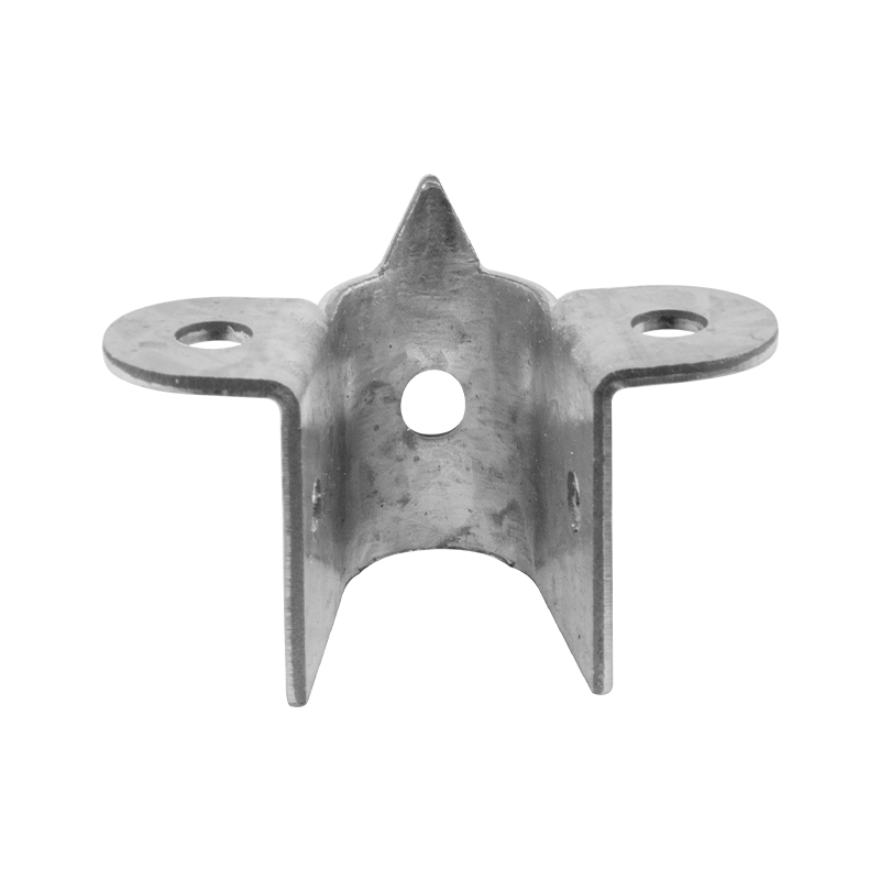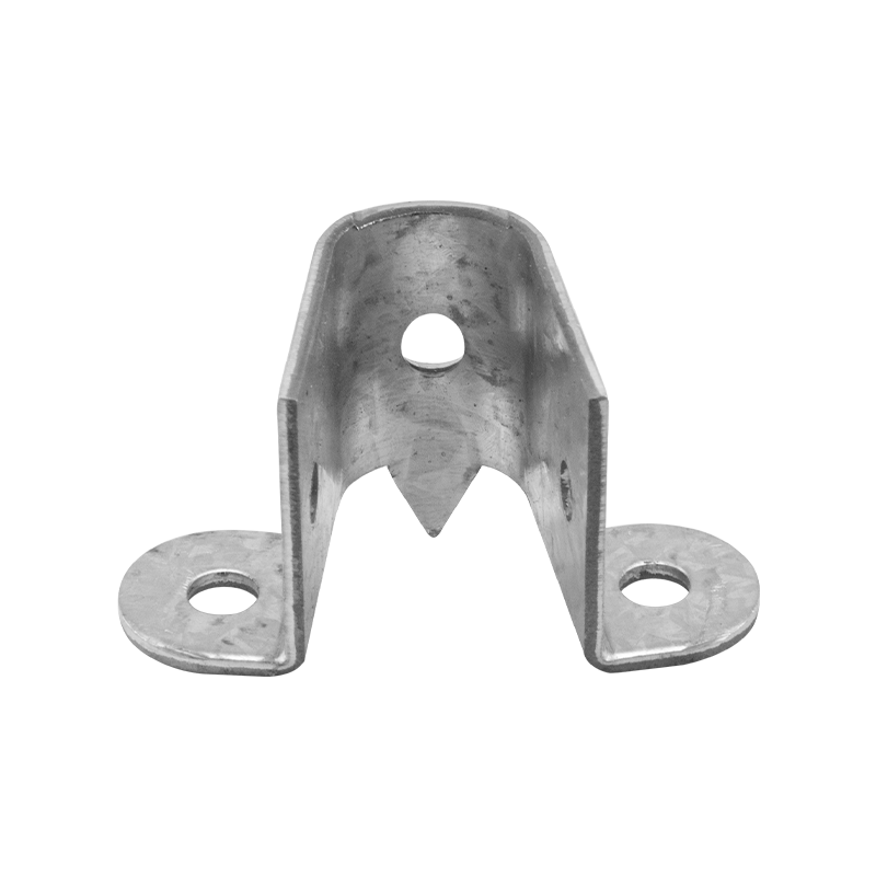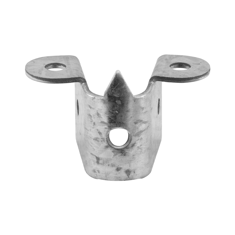 Soporte metálico con 2 puntos de anclaje para costado de cajón de persiana. Válido para alojar directamente la espiga metálica del eje. No admite rodamiento. Distancia entre agujeros: 32 mm.