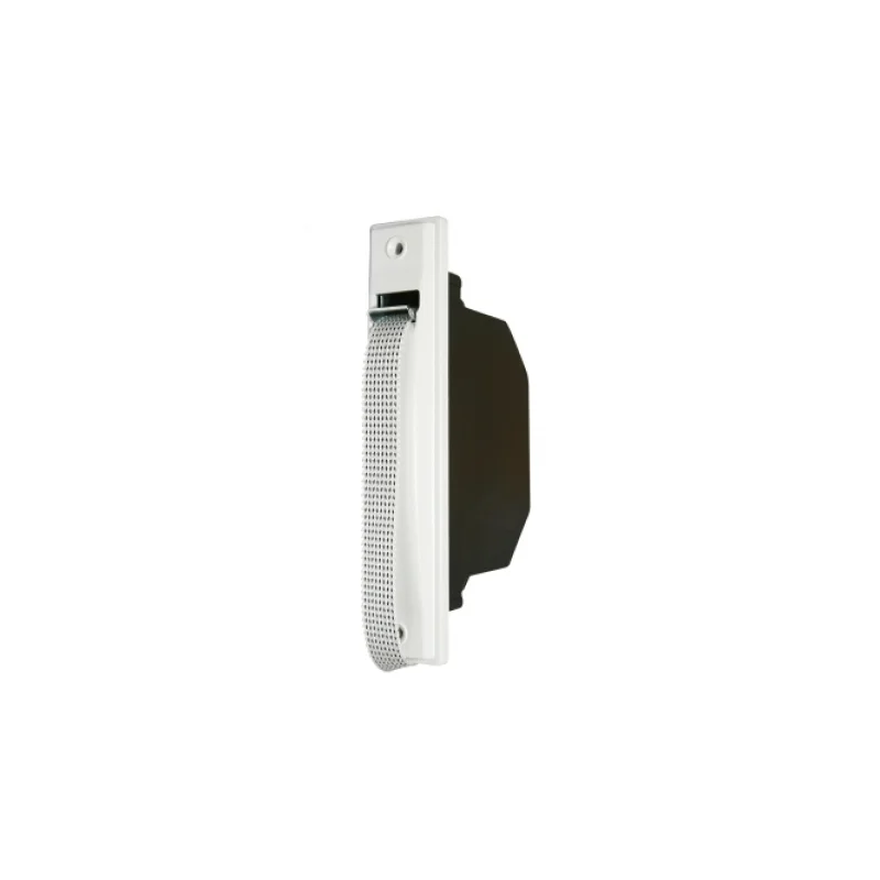 Recogedor de empotrar completo para cinta de persiana de 14 milímetros. Incluye cajetín de pared, rollo de cinta de 14mm de 5 metros de longitud de color blanco con pintas y frente de plástico en color blanco. Embocadura de acero inoxidable. Distancia entre tornillos: 154mm. Ancho del embellecedor frontal: 28mm. (Posibilidad de adquirir un frente de 35mm)